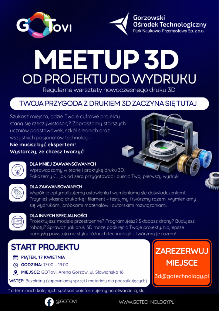 Podczas ostatnich targów edukacyjnych w Arenie Gorzów, stoisko GOTovi cieszyło się ogromnym zainteresowaniem. Odwiedzający pytali o konkretne możliwości rozwoju kompetencji technicznych poza ramami szkolnymi. Odpowiedzią na te potrzeby jest właśnie MEETUP 3D.